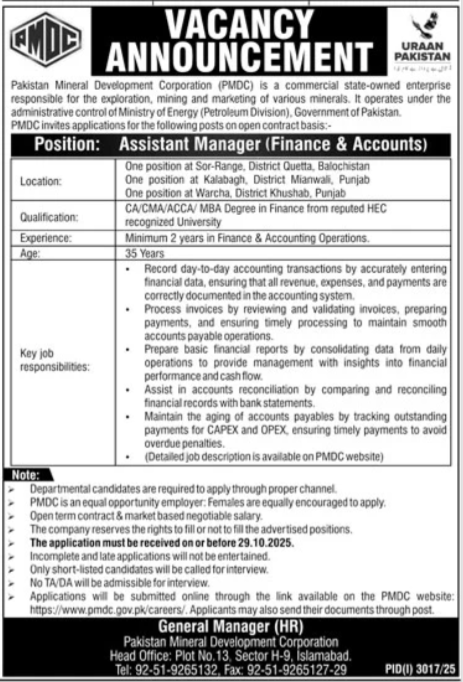 Pakistan Mineral Development Corporation is hiring for the position of Assistant Manager Finance & Accounts. Apply before 29 October, 2025. Read the ad for details on how to apply.