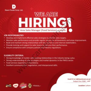 DAWN Foods Corporation Ltd Area Sales Manager (Food Services) Job Opening in Lahore